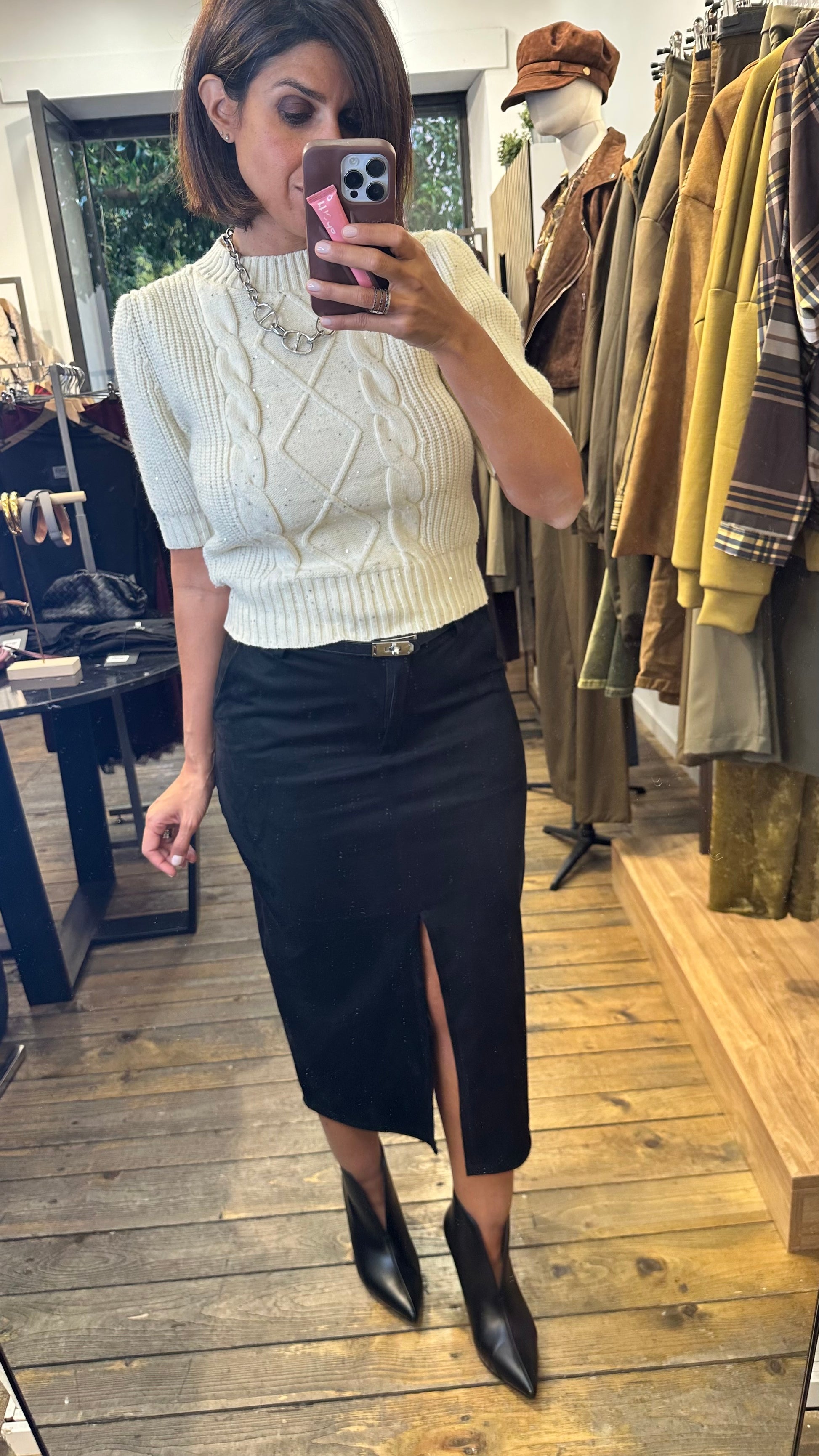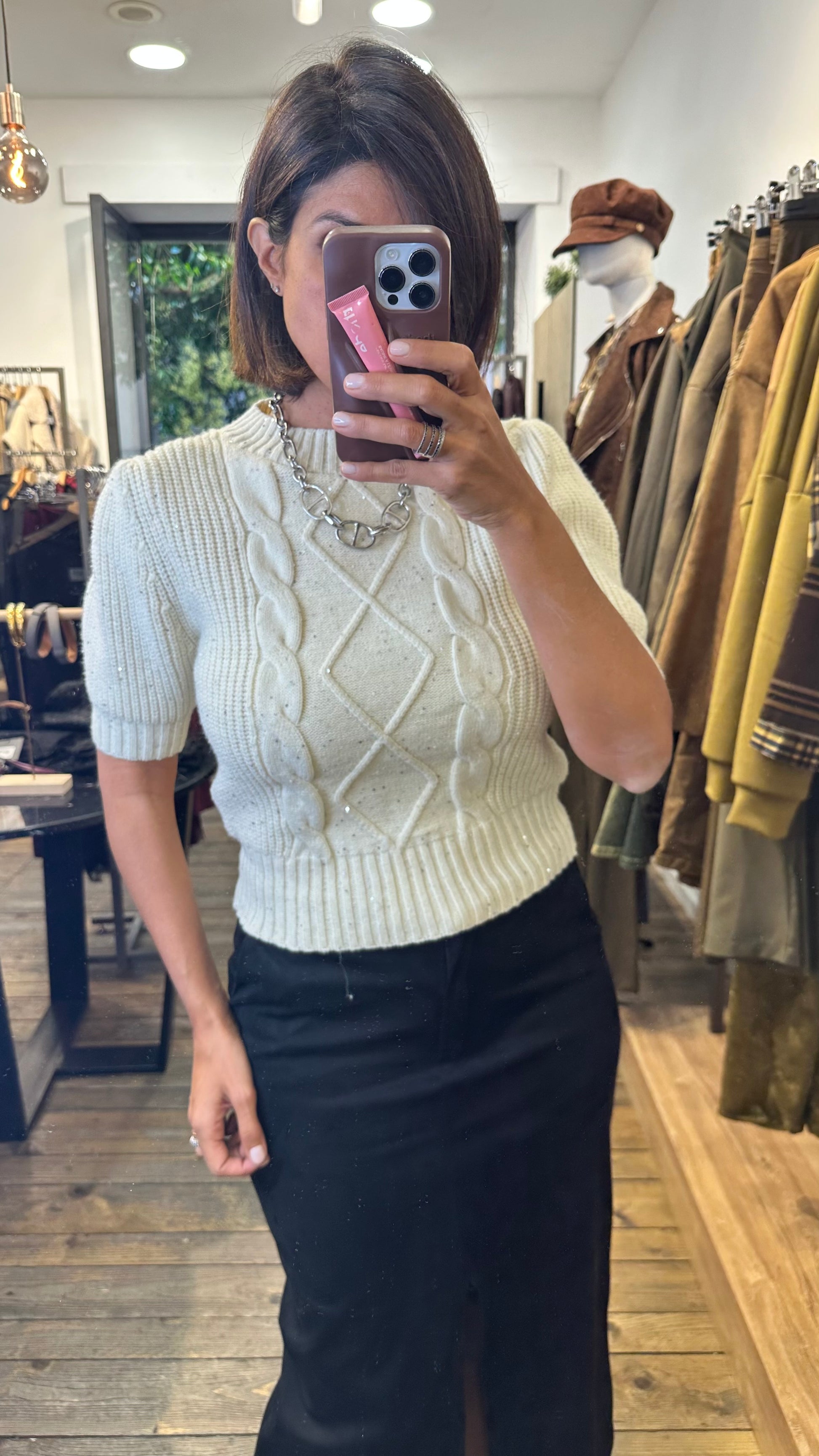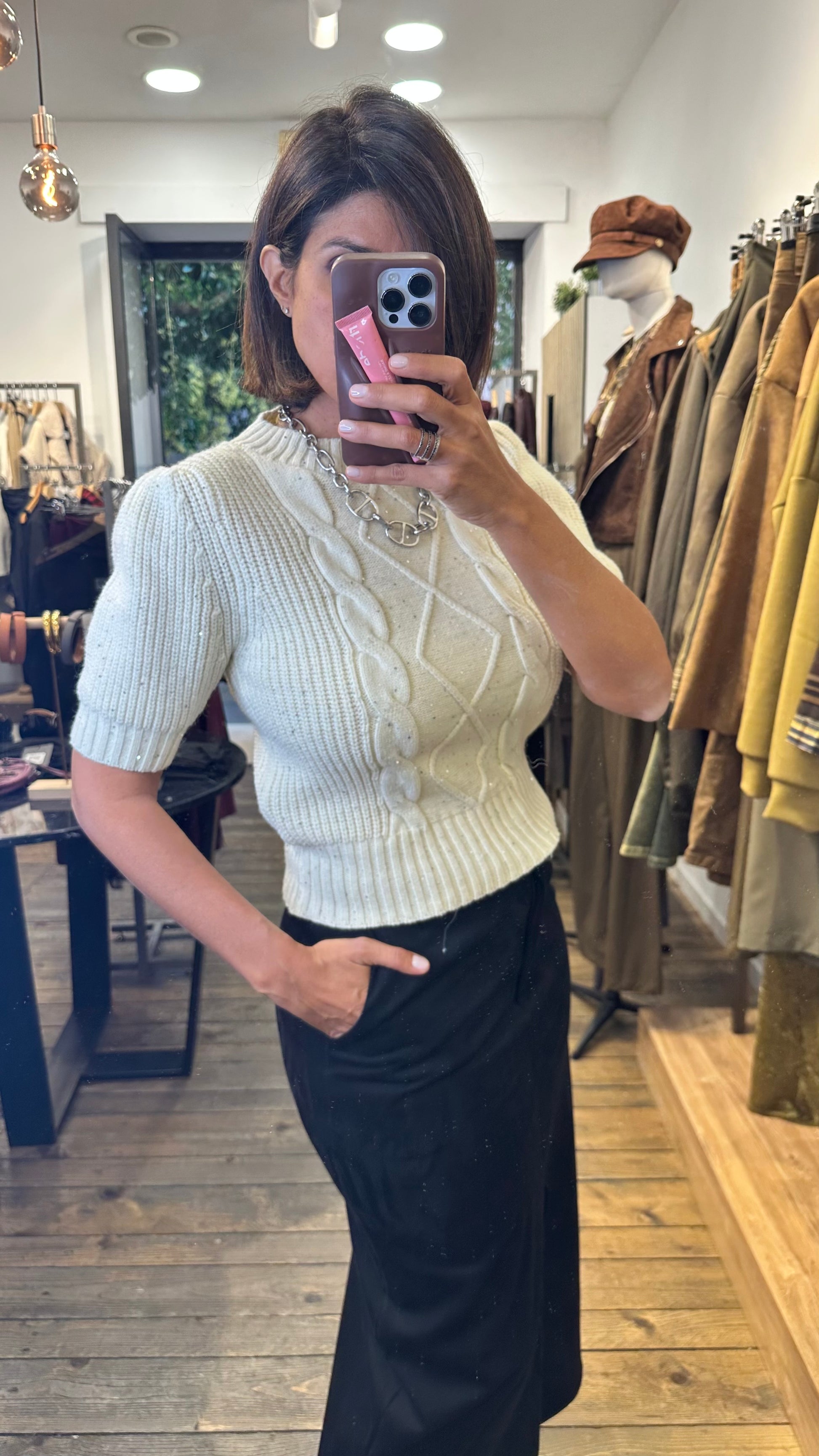 Maglia giro collo a mezza manica con spalline leggermente bombate in maglia lavorata a costine con davanti trecce e rombi . Cosparsa di micro paillette argentate