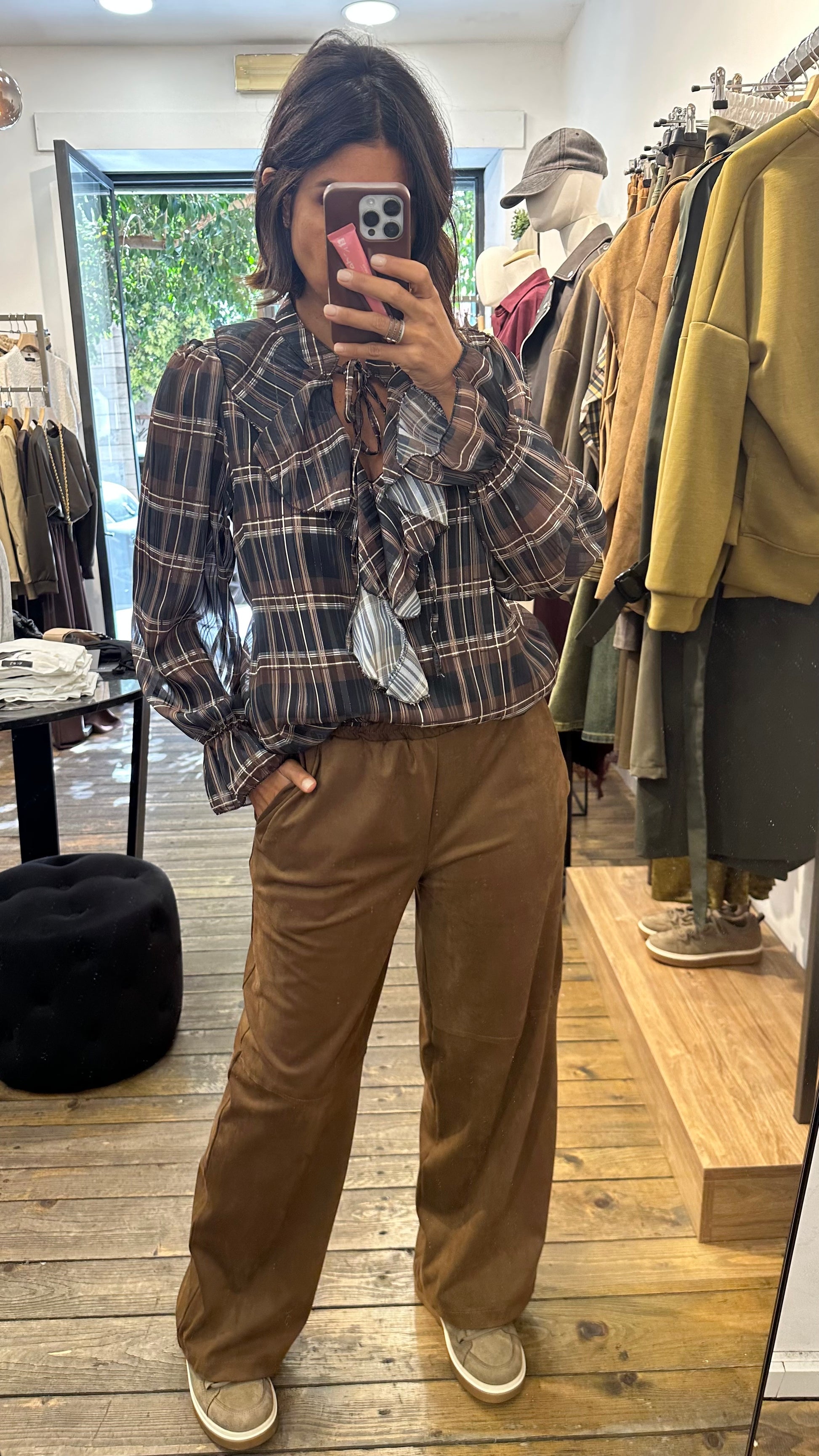 Pantalone in eco daino dritto con elastico e coulisse  in vita , tasche laterali