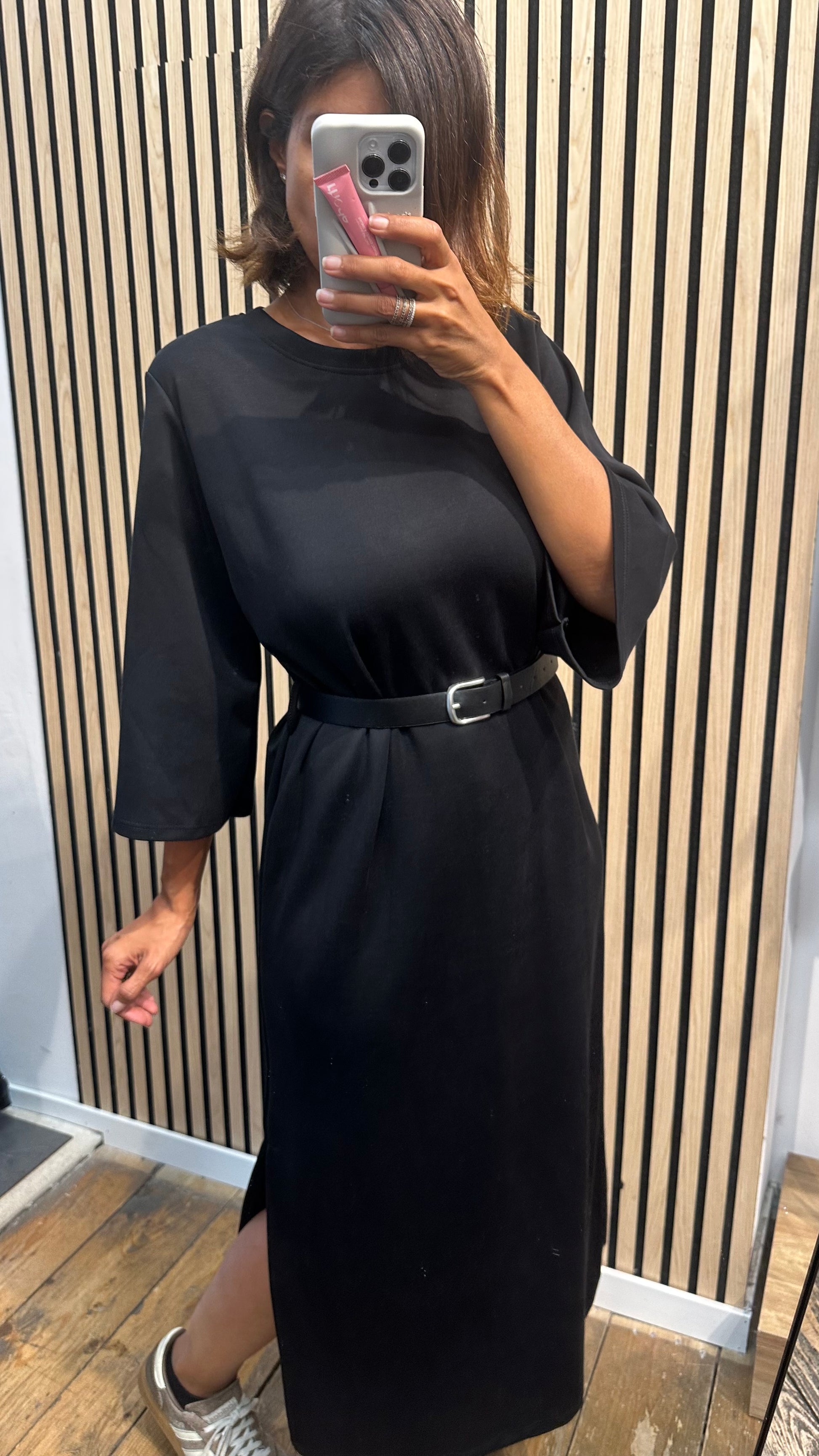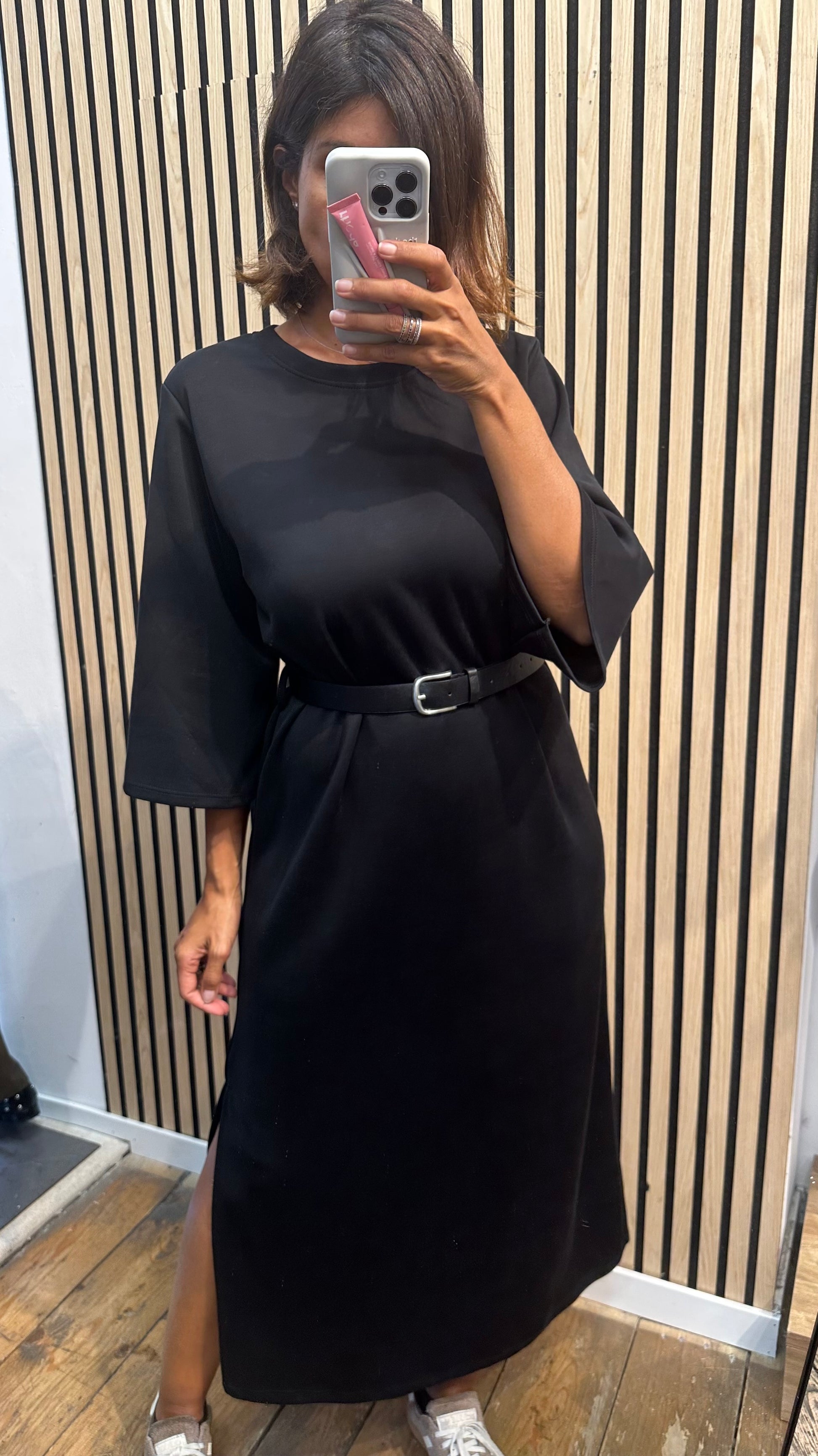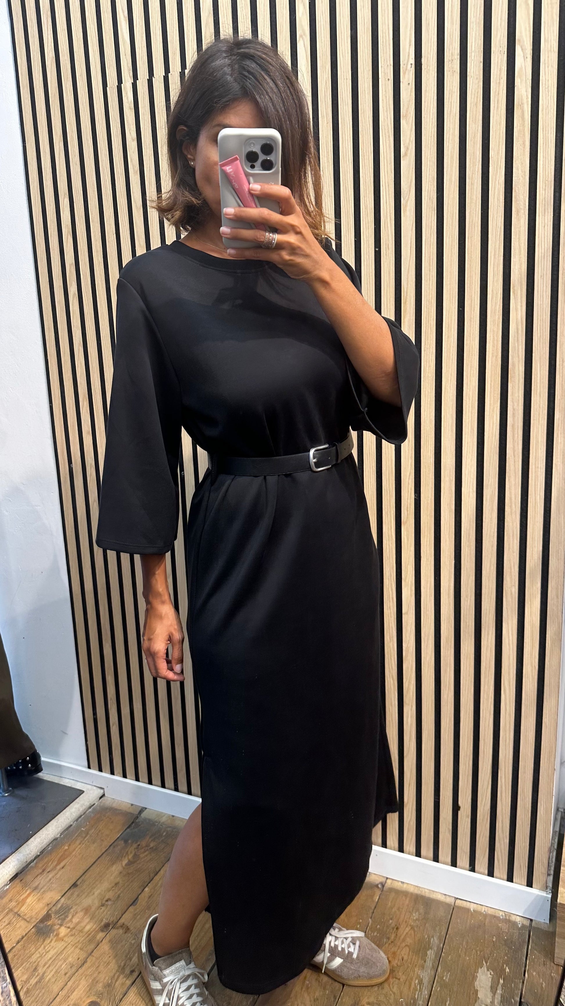abito girocollo , girocollo con manica 3/4 e spacchi laterali , dotato di una cintura in vita