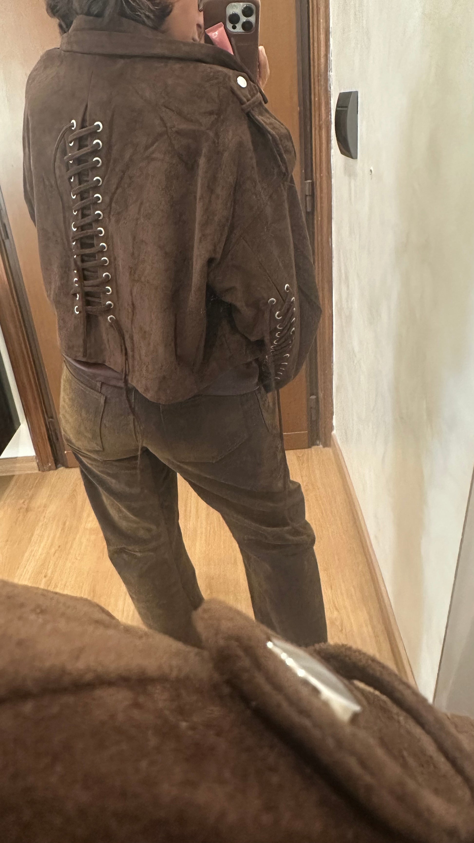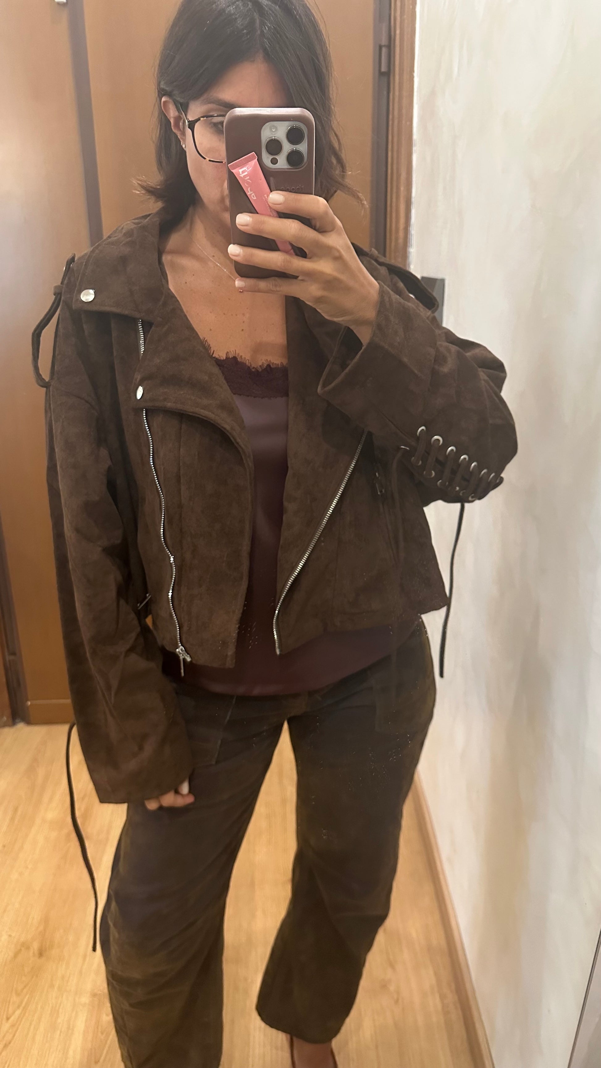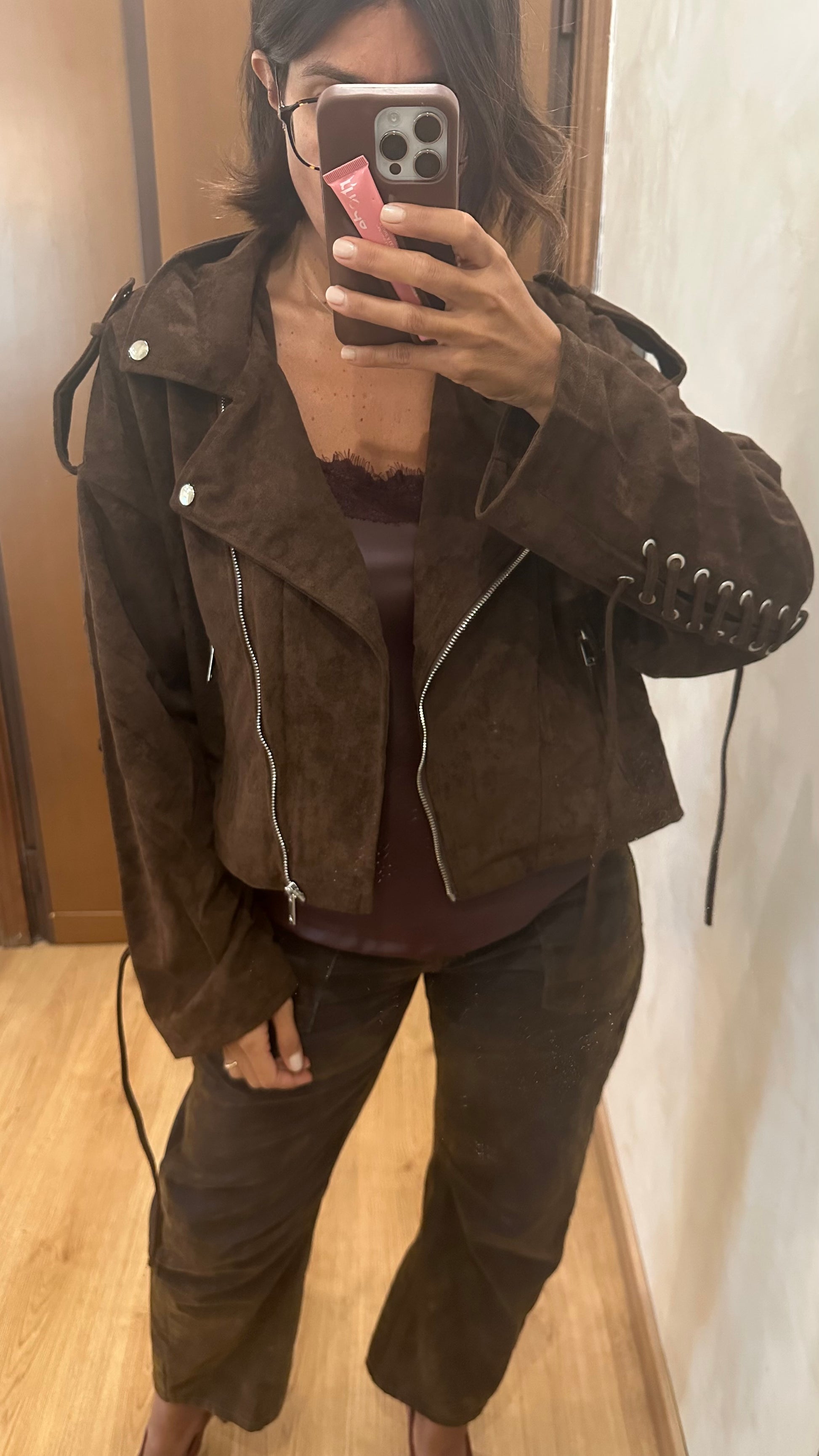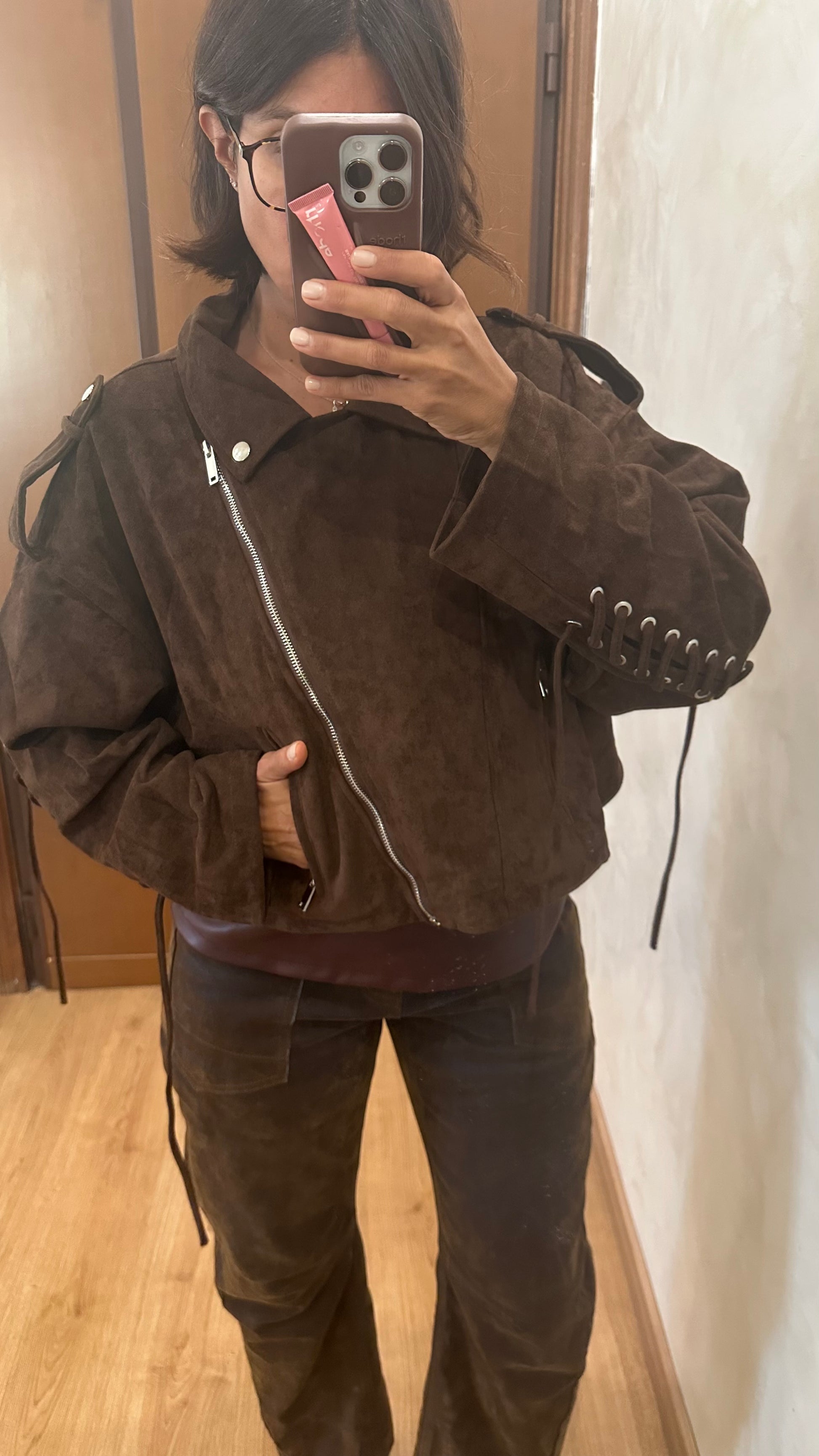 Chiodo in eco daino morbidissimo con zip laterale e lacci intrecciati sul retro maniche e schiena