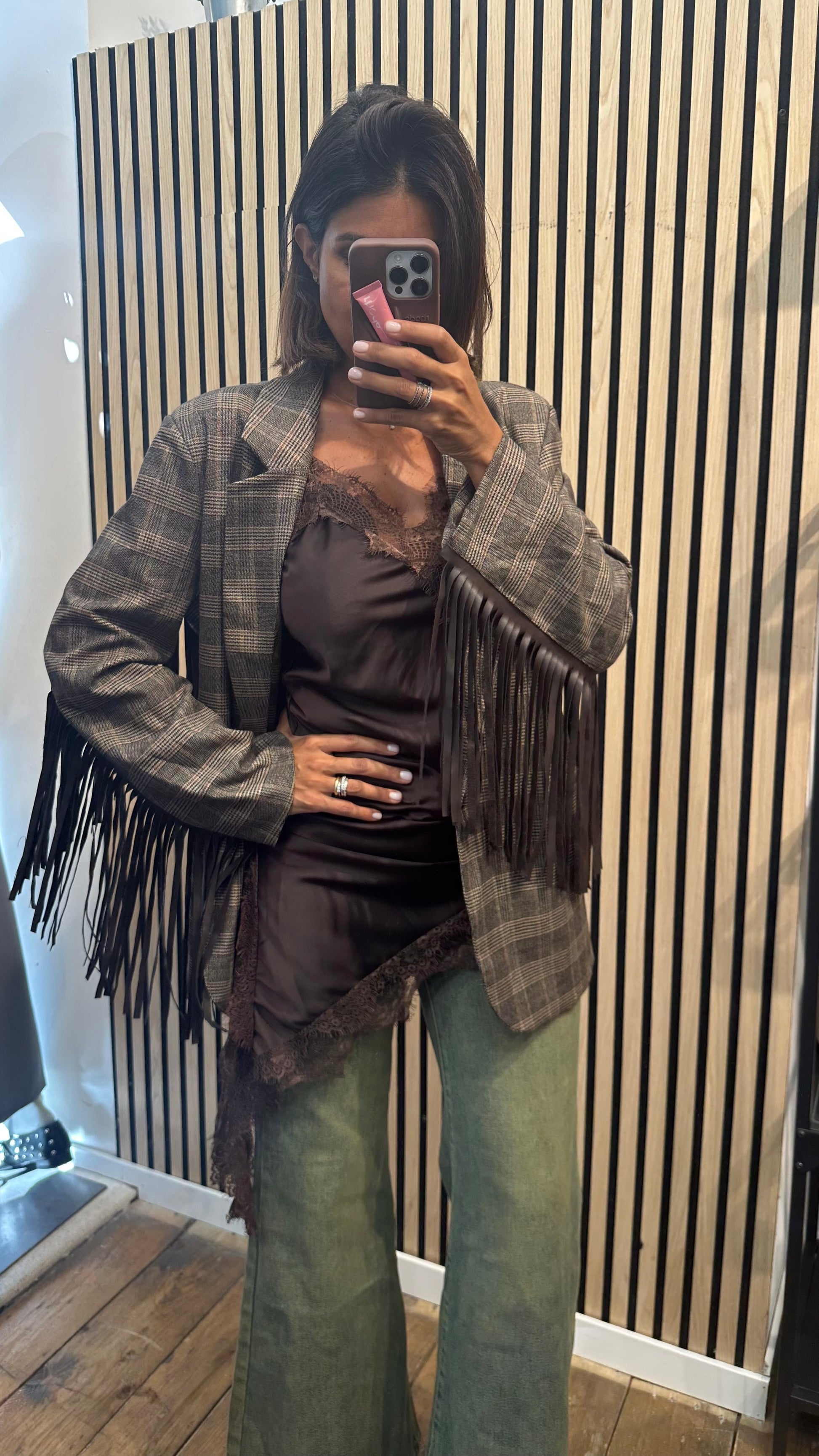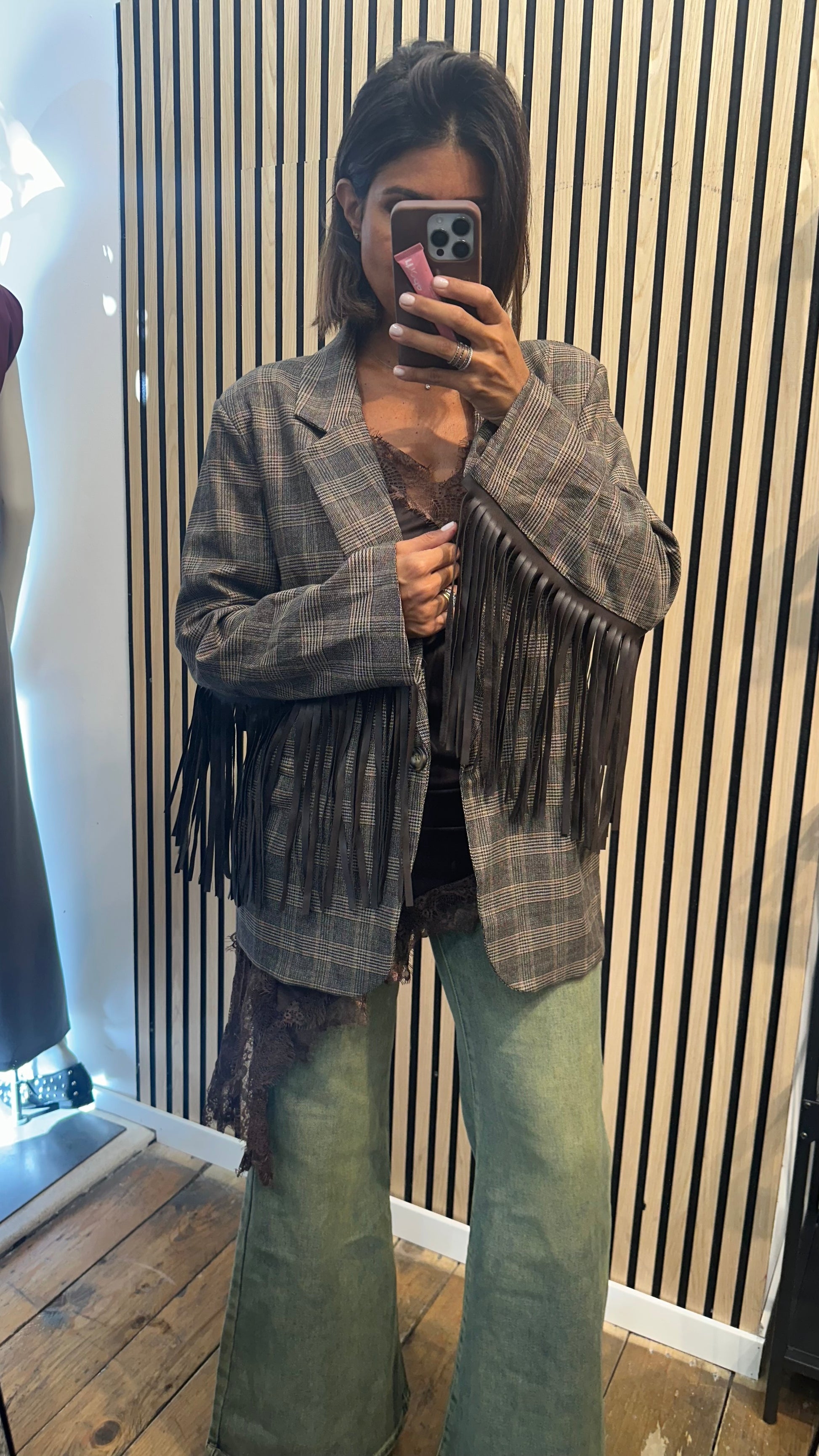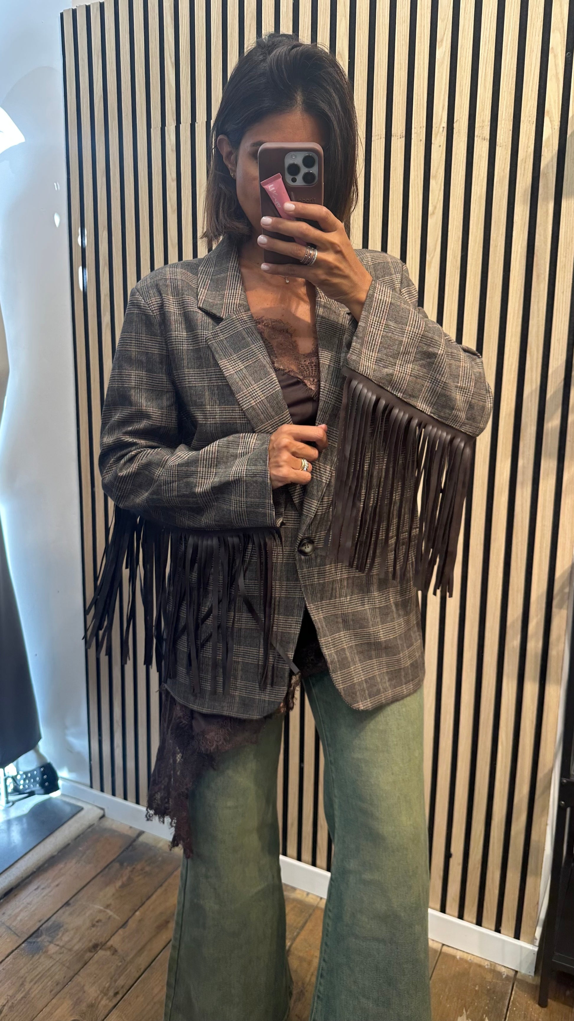 Giacca principe di Galles, over 1 bottone con frange in ecopelle marrone su retro e manica