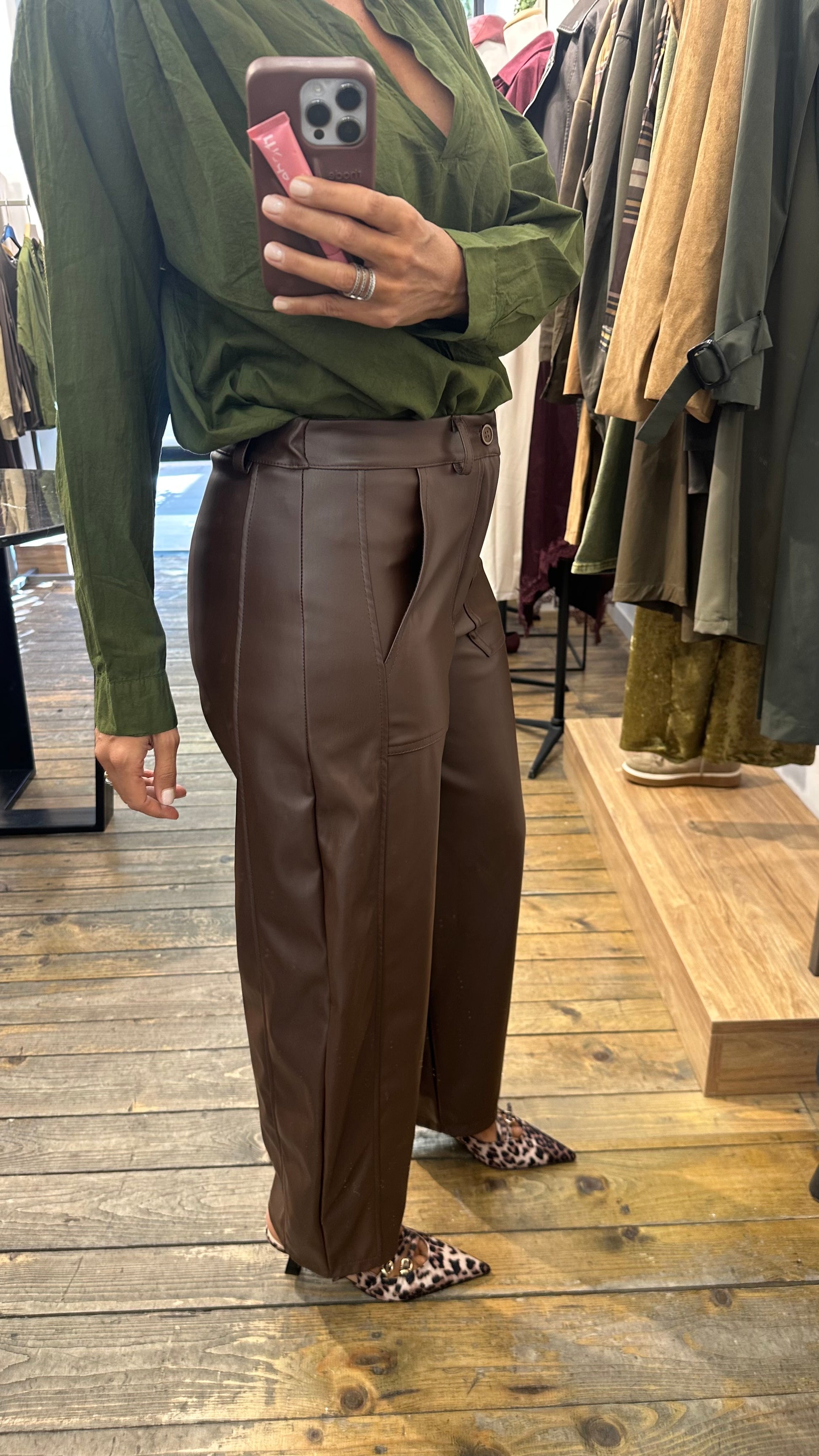 Pantalone Barrel in ecopelle con tasche in evidenza